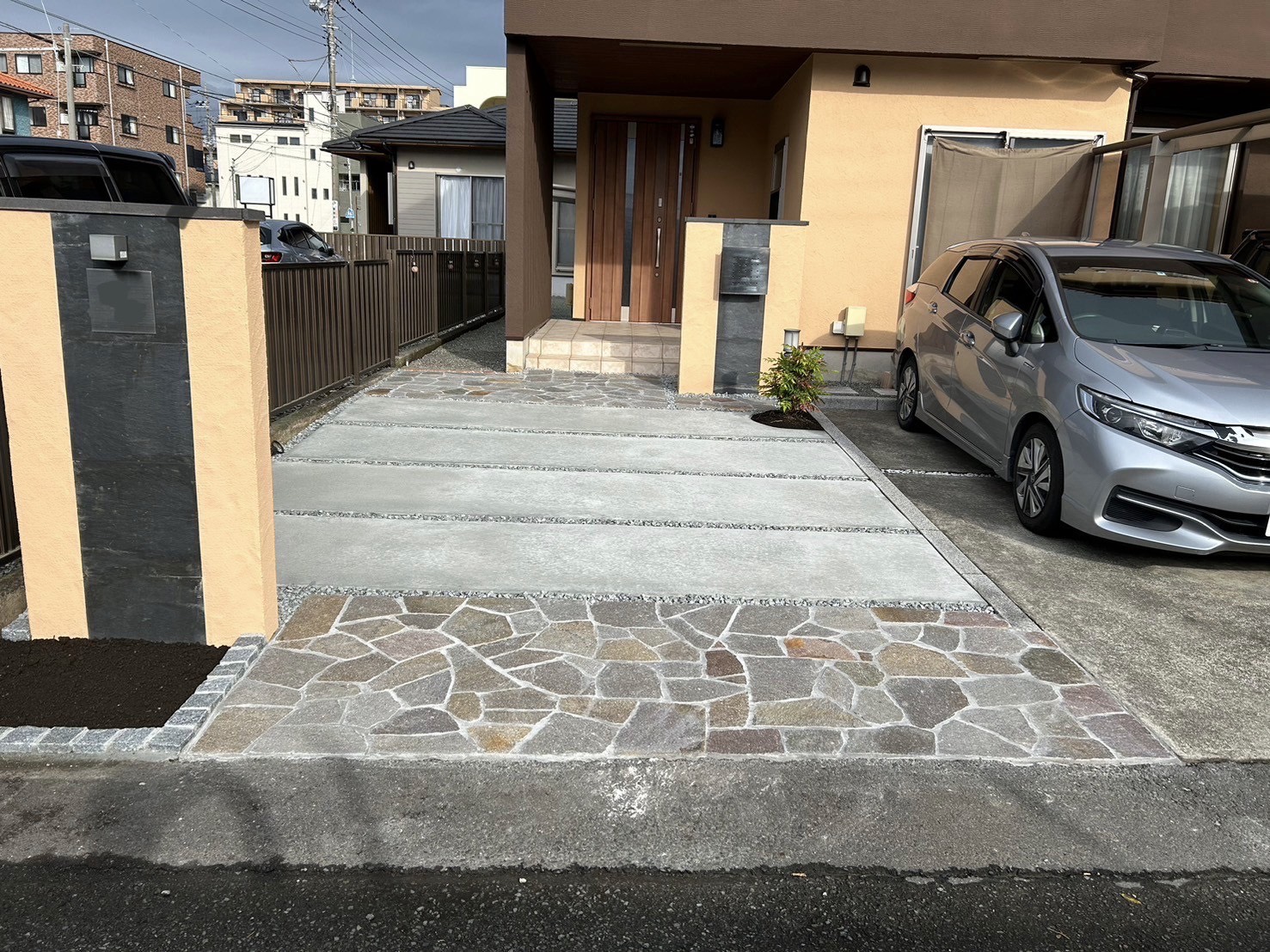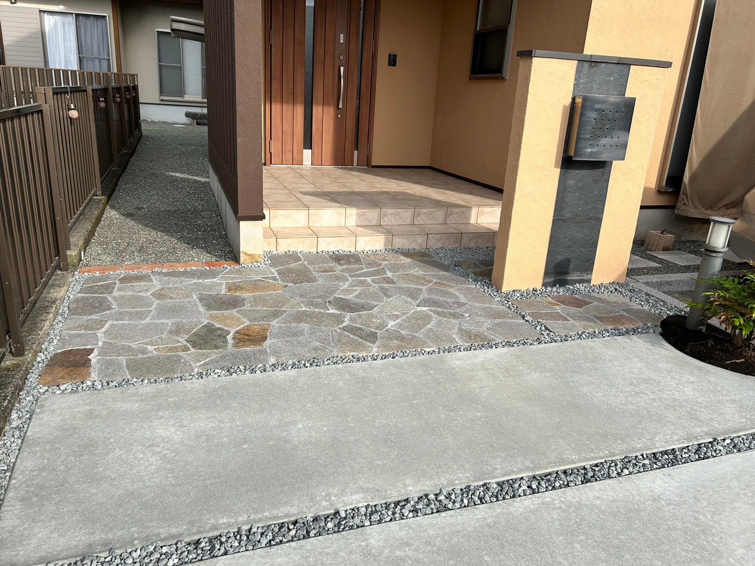アプローチ・門袖・境界塀の施工をしました。アプローチ土間コンクリートユニソン クレモナストーン 乱形石5号砕石