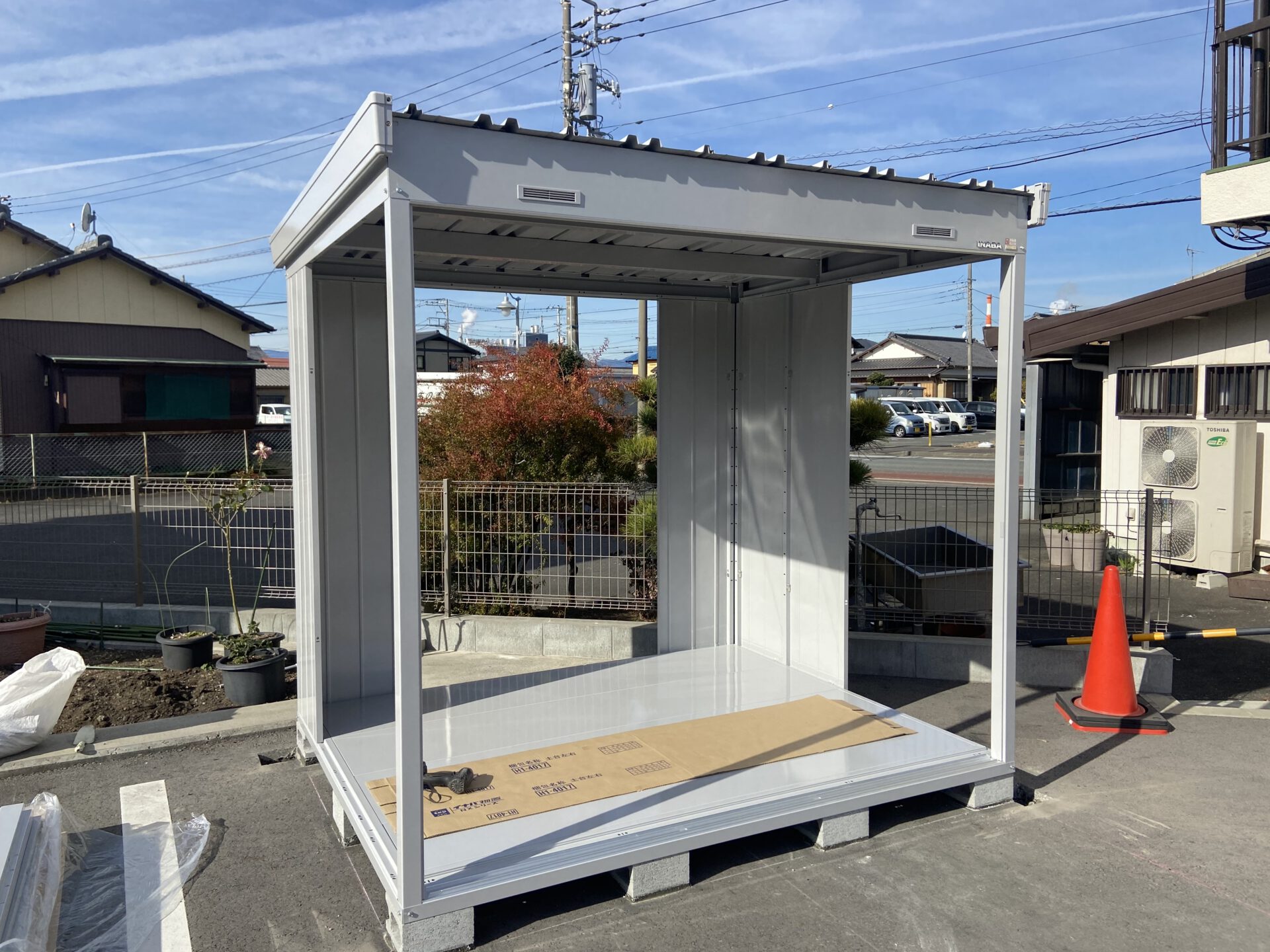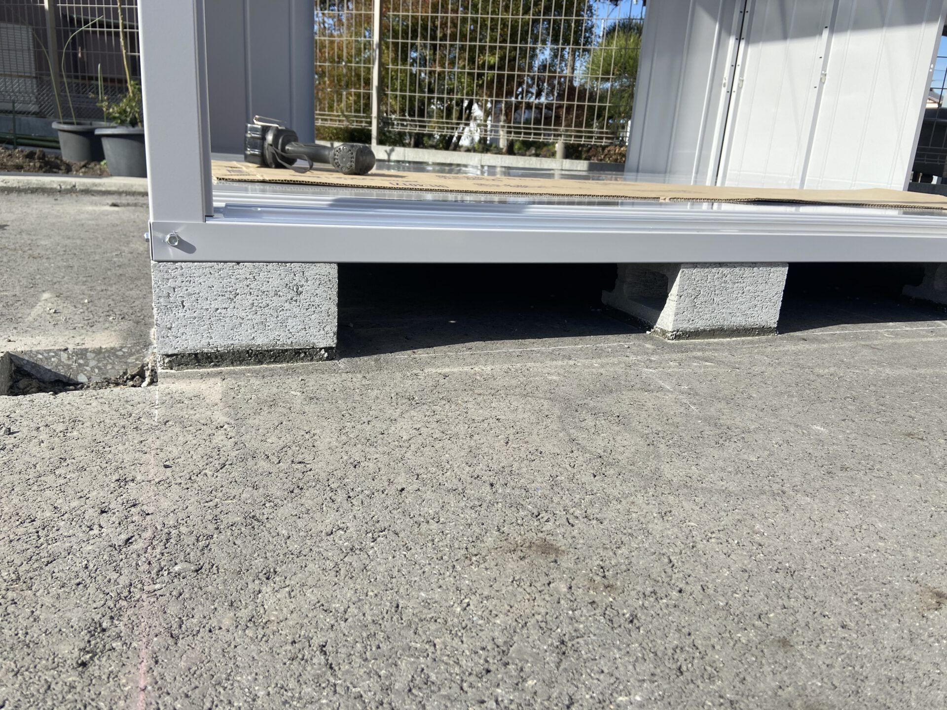 設置場所がアスファルトなので基礎ブロックはモルタルでレベル調整します。転倒防止は必ずした方がいいですよ!